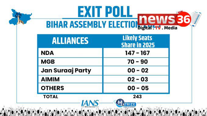 ये आंकड़े सिर्फ मैट्रिज आईएएनएस के एग्जिट पोल के मुताबिक दिए गए हैं. सहीं आंकड़े 14 नवंबर को चुनाव परिणाम आने के बाद ही पता चलेंगे.