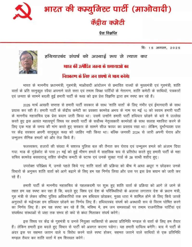 माओवादियों के सीसी मेंबर अभय की और से जारी इस कथित पत्र में उन्होंने हथियार छोड़ने की बात कही है। पत्र में लिखा है, “शांति वार्ता की प्रक्रिया को आगे बढ़ाने के लिए, हम यह स्पष्ट कर रहे हैं कि बदली हुई दुनिया और देश की परिस्थितियों के साथ-साथ प्रधानमंत्री, गृह मंत्री और वरिष्ठ पुलिस अधिकारियों द्वारा हथियार छोड़कर मुख्यधारा में शामिल होने के अनुरोध को देखते हुए, हमने हथियार छोड़ने का फैसला किया है। हमने सशस्त्र संघर्ष पर अस्थायी रोक लगाने का फैसला किया है। भविष्य में, हम सभी राजनीतिक दलों और संघर्षरत संगठनों के साथ मिलकर जन मुद्दों पर लड़ेंगे।”