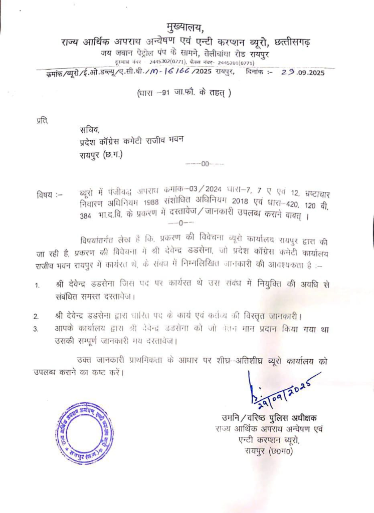 छत्तीसगढ़ में शराब घोटाले मामले में ACB ने कांग्रेस को नोटिस जारी किया है. ACB ने कांग्रेस के प्रभारी महामंत्री मलकीत सिंह गैदू को नोटिस भेजा है, जिसमें शराब घोटाले को लेकर कुछ जानकारियां मांगी है. ACB ने कांग्रेस कार्यालय के एक कर्मचारी देवेंद्र डड़सेना को लेकर जानकारी मांगी है. देवेन्द्र डड़सेना वही व्यक्ति है, जिसका नाम शराब घोटाले में आया था. ACB ने कांग्रेस से तीन बिंदुओं पर जानकारी मांगी है.