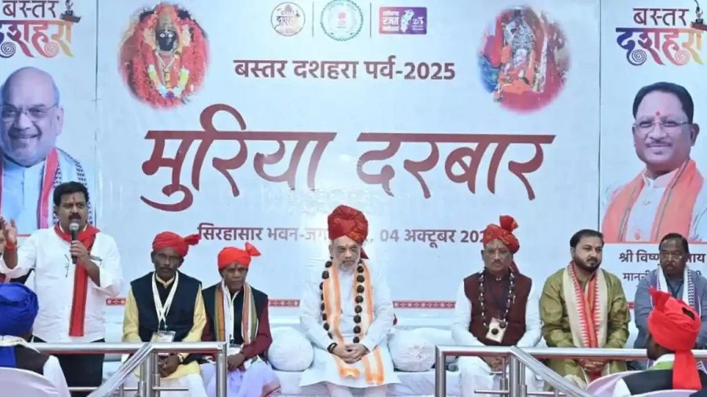 रायपुर 4 अक्टूबर 2025/ केंद्रीय गृह मंत्री अमित शाह और प्रदेश के मुख्यमंत्री विष्णु देव साय बस्तर दशहरा पर्व के अवसर पर जगदलपुर के सिरहासार भवन में आयोजित मुरिया दरबार में शामिल हुए। बस्तर की आराध्य देवी मां दंतेश्वरी के चित्र पर दीप प्रज्वलित करने के पश्चात केंद्रीय गृह मंत्री अमित शाह ने मांझी-चालकी से सीधा संवाद करते हुए बस्तर से माओवाद को समाप्त करने में सहयोग की अपील की। उन्होंने कहा कि माओवाद से जुड़कर हथियार उठा चुके बच्चों को समझाएं कि वे मुख्यधारा में लौटें और शासन की योजनाओं का लाभ लें। केंद्रीय गृह मंत्री शाह ने कहा कि प्रधानमंत्री नरेंद्र मोदी बस्तर के विकास और नक्सलवाद को समाप्त करने के लिए दृढ़ संकल्पित हैं।