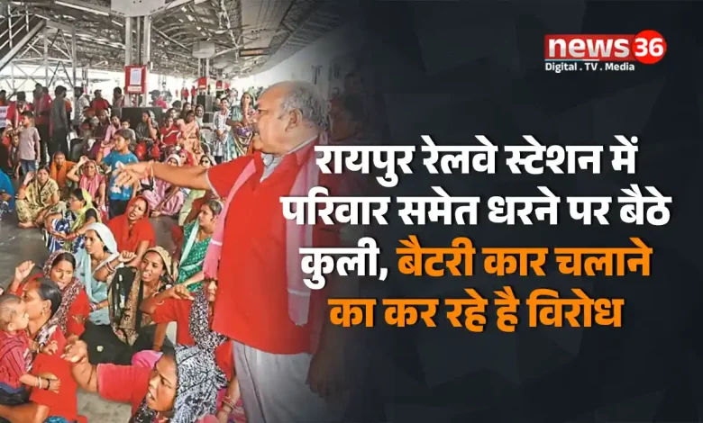 Chhattisgarh : रायपुर रेलवे स्टेशन में परिवार समेत धरने पर बैठे कुली, बैटरी कार चलाने का कर रहे है विरोध