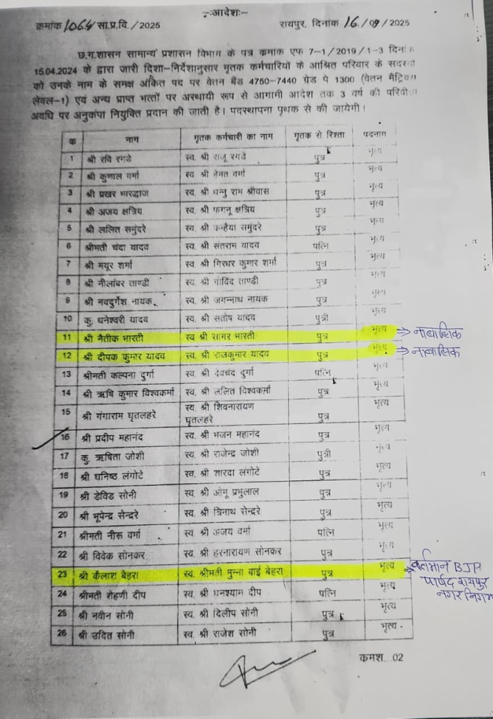 रायपुर। छत्तीसगढ़ की राजनीति में एक नया विवाद सामने आया है। रायपुर नगर निगम के भाजपा पार्षद कैलाश बेहरा को उनकी मां की मृत्यु के बाद भृत्य (चतुर्थ श्रेणी कर्मचारी) के पद पर अनुकंपा नियुक्ति मिली है, जिसे कांग्रेस ने असंवैधानिक और शर्मनाक करार दिया है। कांग्रेस ने राज्य सरकार और नगरीय प्रशासन विभाग पर नियमों की अनदेखी का आरोप लगाया है।