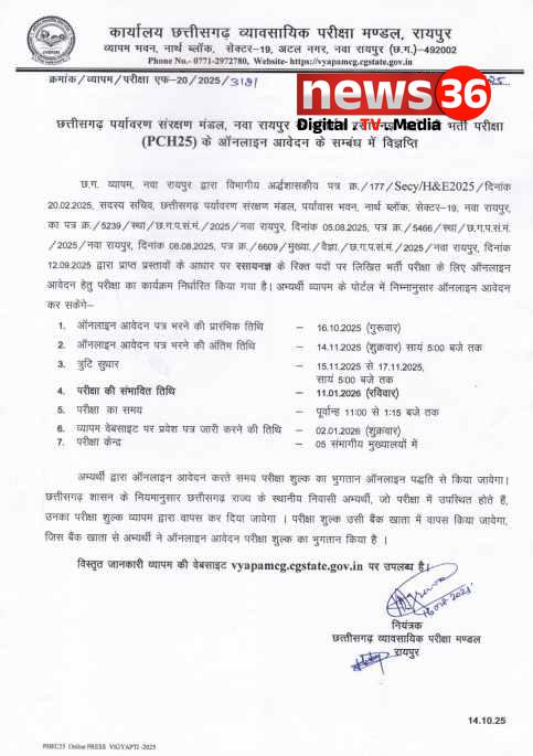 पहले व्यापम की वेबसाइट https://vyapamcg.cgstate.gov.in/ पर जाएं. “PCH25-Chemist Recruitment 2025” लिंक पर क्लिक करें. ऑनलाइन आवेदन पत्र भरें और आवश्यक दस्तावेज अपलोड करें. ऑनलाइन भुगतान करें और आवेदन पत्र सबमिट करें. आवेदन का प्रिंट आउट अवश्य लें.
