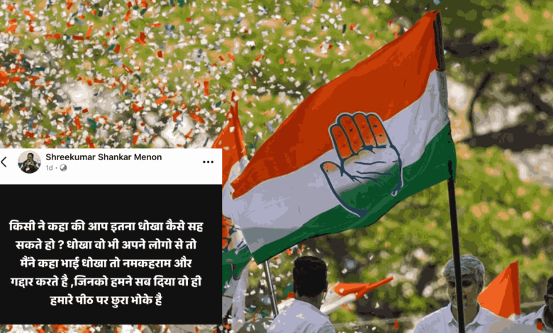 रायपुर से जिलाध्यक्ष पद के प्रमुख दावेदार श्रीकुमार मेनन ने सोशल मीडिया पर अपनी नाराजगी सार्वजनिक कर दी है। उन्होंने एक पोस्ट शेयर की, जिसमें “धोखा”, “गद्दार” और “पीठ में छूरा” जैसे तीखे शब्दों का इस्तेमाल किया गया है। उनकी यह पोस्ट सामने आने के बाद राजनीतिक गलियारों में हलचल मच गई है।
