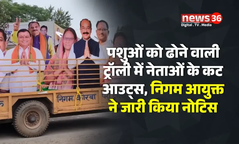 छत्तीसगढ़ राज्य स्थापना की 25वी जयंती पर रजत जयंती महोत्सव मनाया जा रहा है. इस बीच नेताओं के कट आउट का परिवहन पशु ट्रॉली में किया गया. इस मुद्दे ने अब तूल पकड़ लिया है. मेयर के निर्देश पर अपर आयुक्त ने अधिकारी और कर्मचारियों को नोटिस जारी कर दिया है.