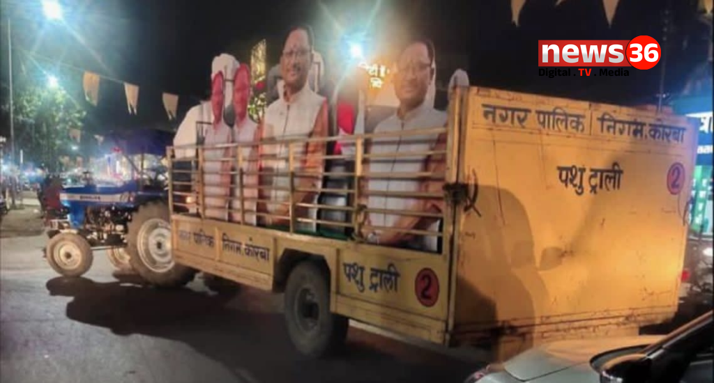 पशुओं को ढोने वाली ट्रॉली में नेताओं के कट आउट्स, निगम आयुक्त ने जारी किया नोटिस