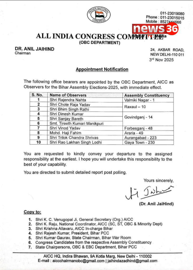 बता दे कि कांग्रेस नेता त्रिलोक श्रींवास, राष्ट्रीय समन्वयक – अखिल भारतीय कांग्रेस कमेटी, प्रभारी – उत्तर प्रदेश तथा गुजरात प्रदेश, सचिव- प्रदेश कांग्रेस कमेटी छत्तीसगढ़, को बिहार में हो रहे विधानसभा चुनाव में औरंगाबाद और गया का वरिष्ठ पर्यवेक्षक नियुक्त किया गया है, अखिल भारतीय कांग्रेस कमेटी( पि. व. विभाग) के राष्ट्रीय अध्यक्ष डॉ. अनिल जयहिंद ने राष्ट्रीय अध्यक्ष मल्लिकार्जुन खड़गे एवं राष्ट्रीय संगठन प्रभारी के. सी. वेणुगोपाल के निर्देशानुसार उन पर विश्वास जताते हुए उन्हें महत्वपूर्ण जिम्मेदारी सौंपी है