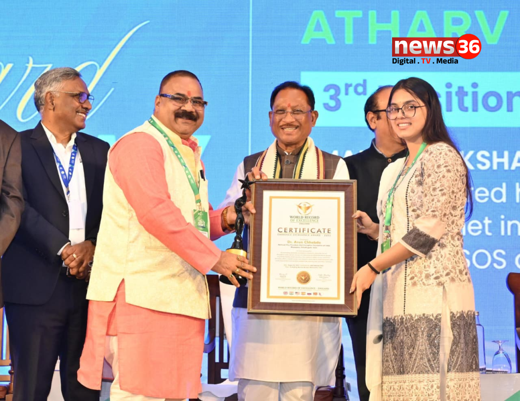 मुख्यमंत्री विष्णु देव साय ने एग्रोफेब सस्टेनेबल स्टार्टअप के लिए करण चंद्राकर, वर्टेक्स सुइट के लिए सजल मल्होत्रा और लैरक एआई के लिए अमित पटेल को सम्मानित किया।