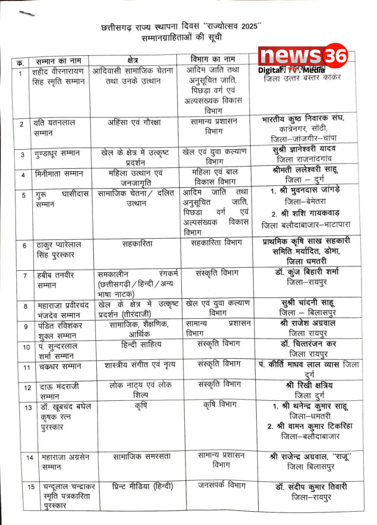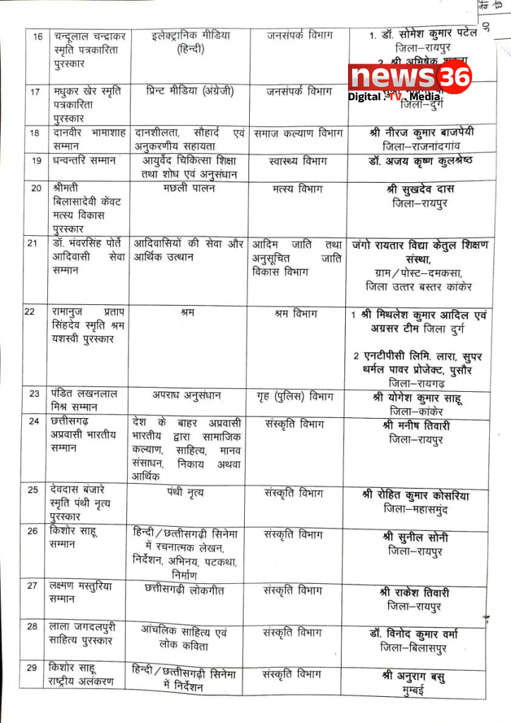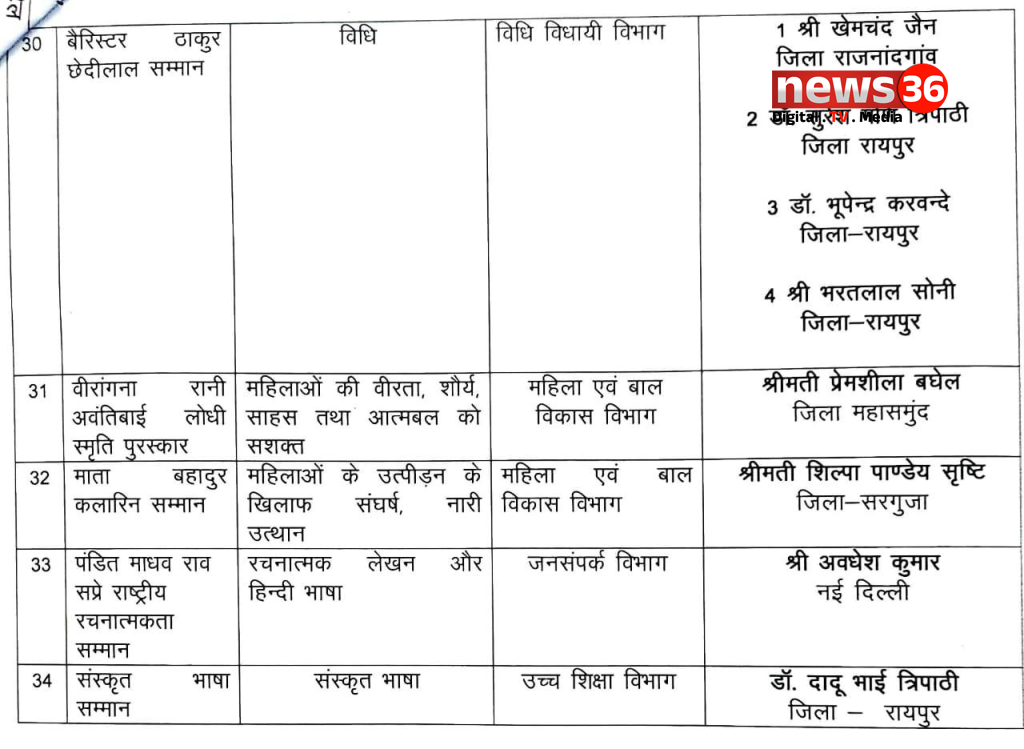 राज्य अलंकरण के चयनीत नामों की घोषणा, देखे किन किन क्षेत्रों में किन्हें मिला पुरुस्कार