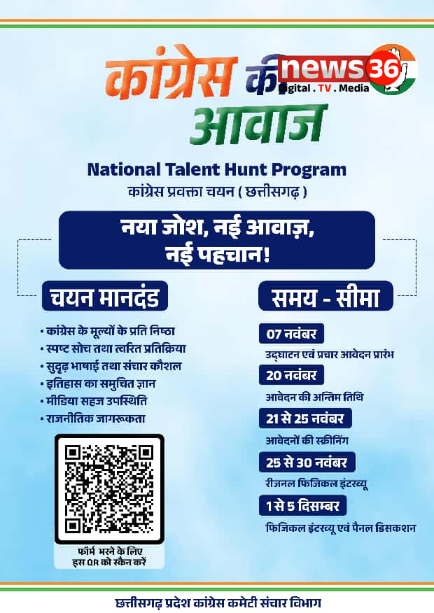 रायपुर | कांग्रेस पार्टी ने शुक्रवार को छत्तीसगढ़ में ‘नेशनल टैलेंट हंट’ कार्यक्रम की शुरुआत की। इस अभियान के तहत पार्टी प्रतिभाशाली युवाओं को जिला, प्रदेश और राष्ट्रीय स्तर पर प्रवक्ता बनने का अवसर देगी।