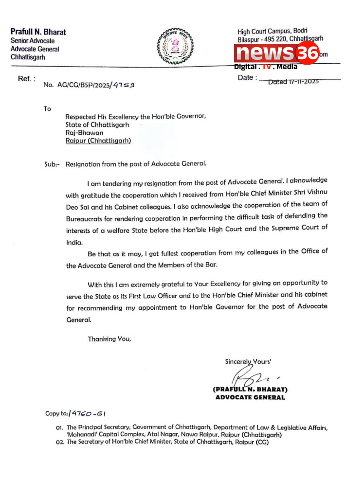 Prafulla N. Bharat Resigned: छत्तीसगढ़ के महाधिवक्ता प्रफुल्ल एन भारत ने सोमवार को अपने पद से इस्तीफा दे दिया। अधिकारियों ने यह जानकारी दी। अधिकारियों ने बताया कि भारत ने राज्यपाल रमन डेका को अपना इस्तीफा सौंप दिया है। भारत ने ‘पीटीआई-भाषा’ से फोन पर बात करते हुए, अपने इस्तीफे की पुष्टि की, लेकिन अपने फैसले का कारण नहीं बताया। अपने त्यागपत्र में भारत ने मुख्यमंत्री विष्णु देव साय, उनके मंत्रिमंडल के सहयोगियों और वरिष्ठ नौकरशाहों के प्रति उनके समर्थन के लिए आभार व्यक्त किया है। भारत को पिछले साल जनवरी में महाधिवक्ता नियुक्त किया गया था। अधिकारियों ने बताया कि भारत ने इससे पहले 2014 से 2018 तक रमन सिंह के नेतृत्व वाली भाजपा सरकार के दौरान राज्य के अतिरिक्त महाधिवक्ता के रूप में कार्य किया था।