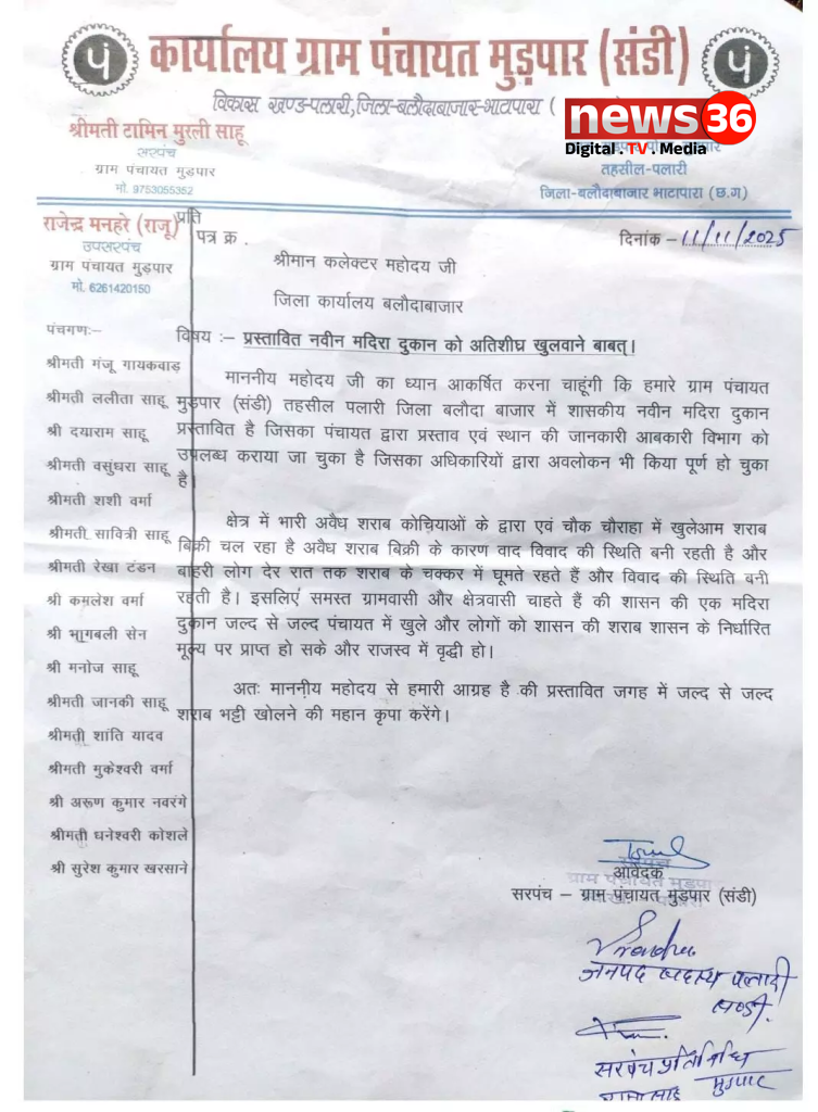 बलौदाबाजार जिले के पलारी तहसील के ग्राम पंचायत मुडपार (संडी) में अवैध शराब की बिक्री ने ग्रामीणों का जीना मुहाल कर दिया है। लगातार शिकायतों के बावजूद कार्रवाई न होते देख अब गांव के लोगों ने कलेक्टर के नाम ज्ञापन भेजकर गांव में ही सरकारी शराब दुकान खोलने की अनोखी मांग रखी है।