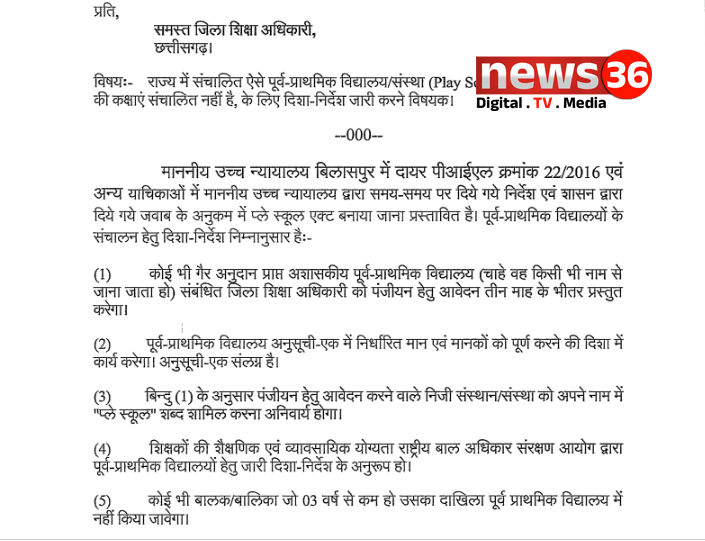 छत्तीसगढ़ शासन स्कूल शिक्षा विभाग मंत्रालय महानदी भवन, नया रायपुर अटल नगर द्वारा जारी पत्र में स्कूल शिक्षा विभाग ने गाइडलाइंस जारी किया है । जिसमें कहा गया है कि छत्तीसगढ़ में संचालित सभी प्ले स्कूल अब स्कूल शिक्षा विभाग के अधीन होंगे।