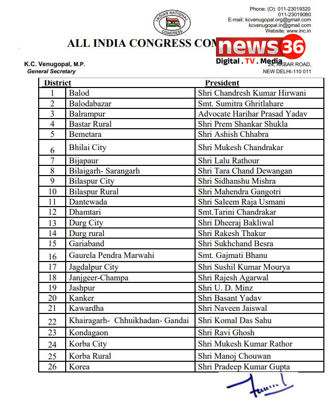 छत्तीसगढ़ कांग्रेस में नए जिला अध्यक्षों की नियुक्ति, देखिये पूरी लिस्ट