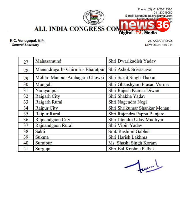 रायपुर। छत्तीसगढ़ कांग्रेस संगठन में बड़ा बदलाव करते हुए अखिल भारतीय कांग्रेस कमेटी (AICC) ने प्रदेश के विभिन्न जिला कांग्रेस कमेटियों के लिए नए अध्यक्षों की नियुक्ति कर दी है। शुक्रवार को जारी सूची में कुल 41 शहरी और ग्रामीण जिला अध्यक्षों के नाम शामिल हैं, जिनकी नियुक्ति तत्काल प्रभाव से मानी जाएगी।