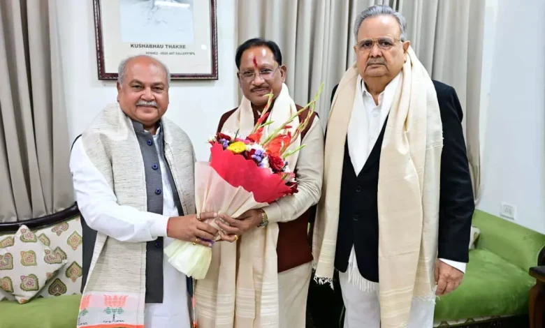 Bhopal/Raipur. छत्तीसगढ़ के मुख्यमंत्री विष्णुदेव साय ने अपने भोपाल प्रवास के दौरान मध्यप्रदेश विधानसभा अध्यक्ष नरेंद्र सिंह तोमर से उनके सरकारी निवास पर सौजन्य भेंट की। इस बैठक में दोनों नेताओं ने राजनीतिक, प्रशासनिक और विकास संबंधी मुद्दों पर खुलकर विचार-विमर्श किया। मुख्यमंत्री साय ने कहा कि छत्तीसगढ़ और मध्यप्रदेश के बीच ऐतिहासिक, सांस्कृतिक और आर्थिक संबंध हमेशा से विशेष रहे हैं, जिन्हें और मजबूत बनाने के लिए निरंतर प्रयास जारी हैं।
