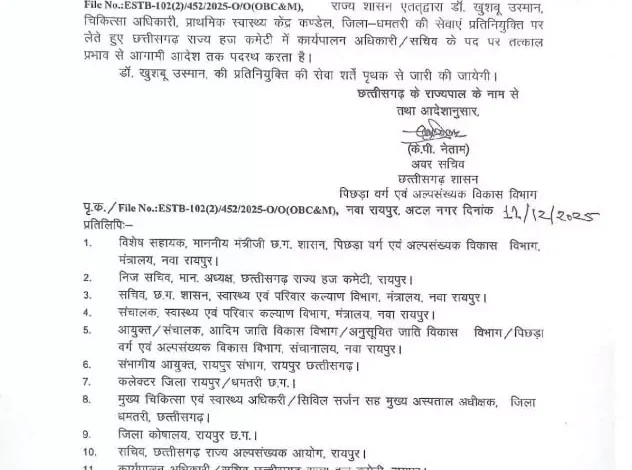 सरकार द्वारा जारी आदेश में कहा गया है कि डॉ. खुशबू उस्मान, जो वर्तमान में धमतरी जिले के प्राथमिक स्वास्थ्य केंद्र कण्डेल में चिकित्सा अधिकारी के पद पर सेवा दे रही थीं, उनकी सेवाओं को प्रतिनियुक्ति पर लेते हुए उन्हें छत्तीसगढ़ राज्य हज कमेटी में कार्यपालन अधिकारी/सचिव के पद पर पदस्थ किया गया है। उनकी प्रतिनियुक्ति से संबंधित विस्तृत सेवा शर्तें बाद में अलग से जारी की जाएंगी।