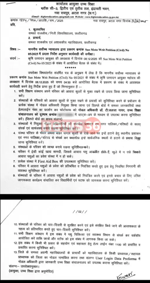 उच्च शिक्षा विभाग ने सभी शासकीय-अशासकीय कॉलेजों और सरकारी-निजी विश्वविद्यालयों को आवारा कुत्तों की निगरानी के लिए विस्तृत गाइडलाइन जारी की है। हर संस्थान में एक प्रोफेसर या सहायक प्रोफेसर को नोडल अधिकारी बनाया जाएगा, जो पूरे कैंपस में कुत्तों और अन्य आवारा पशुओं की स्थिति पर नजर रखेगा।