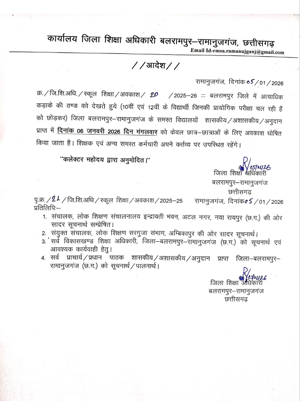 सरगुजा संभाग में सबसे अधिक ठंड पड़ रही है और दिन में भी शीतलहर चल रहा है इसकी वजह से लोगों की दिनचर्या प्रभावित हो रही है लोग समय पर घर से नहीं निकल पा रहे हैं. इसकी वजह से सबसे अधिक प्रभावित स्कूल जाने वाले बच्चे हो रहे हैं यही वजह है कि बलरामपुर जिला शिक्षा अधिकारी ने बच्चों के लिए स्कूल में छुट्टी का आदेश जारी किया है हालांकि आदेश में कहा गया है कि हायर सेकंडरी और हाई स्कूल के जिन बच्चों की प्रायोगिक परीक्षाएं हैं उनके लिए यह छुट्टी का आदेश नहीं है.