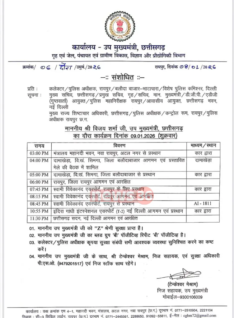 गुरुवार को कवर्धा से रायपुर तक गलियारों में तब हलचल मच गई, जब विजय शर्मा के दो अलग-अलग प्रोटोकॉल सामने आए। पहले डिप्टी सीएम विजय शर्मा हेलीकॉप्टर से बालोद के दुधली गाँव पहुँचने वाले थे, जहाँ उन्हें राष्ट्रीय जंबूरी का उद्घाटन करना था। लेकिन अचानक दुधली (जंबूरी) का नाम काट दिया गया। अब वे केवल बलौदाबाजार के दमाखेड़ा मेले की बैठक में शामिल होंगे। ऐसी चर्चा है कि मामला हाई कोर्ट में जाने और अपनों के बीच ही तलवारें खिंचने के चलते डिप्टी सीएम ने इस विवादित मंच से दूरी बनाना ही ‘सुरक्षित’ समझा