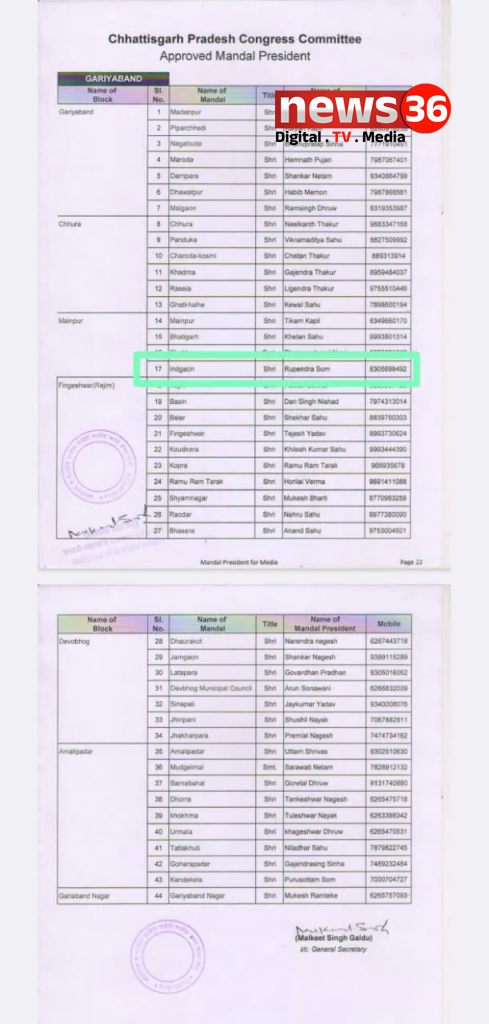 Chhattisgarh State Congress Commette : गुरुवार को विभिन्न जिलों के ब्लॉक अध्यक्षों की सूची जारी की गई, जिसमें गरियांबद जिले के इंदागांव मंडल के अध्यक्ष के रूप में एक मृत व्यक्ति स्व. रुपेंद्र सोम का नाम शामिल है. दिलचस्प बात यह है कि पूर्व ब्लाक अध्यक्ष रुपेंद्र सोम की मृत्यु पिछले साल 22 अगस्त को हो चुकी है.