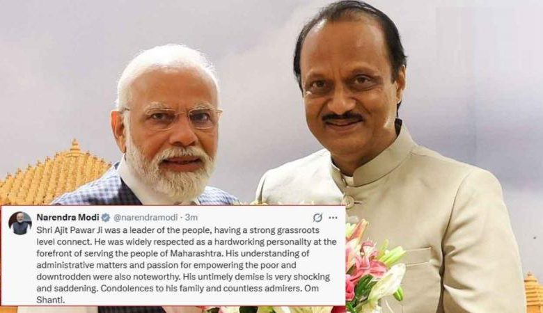 प्रधानमंत्री नरेंद्र मोदी ने अजित पवार के निधन पर गहरा दुख जताते हुए सोशल मीडिया पर पोस्ट साझा किया। उन्होंने लिखा कि अजित पवार एक जननेता थे, जिनका जमीनी स्तर पर गहरा जुड़ाव था और महाराष्ट्र की जनता की सेवा में उनकी अहम भूमिका रही।