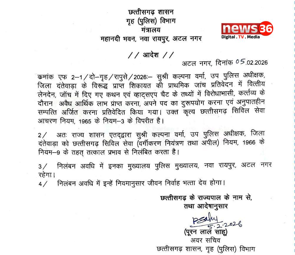 Chhattisgarh : छत्तीसगढ़ सरकार ने पुलिस विभाग में कड़ा संदेश देते हुए दंतेवाड़ा में पदस्थ उप पुलिस अधीक्षक (DSP) कल्पना वर्मा को तत्काल प्रभाव से निलंबित कर दिया है। राज्य शासन के गृह विभाग द्वारा जारी आदेश के बाद यह कार्रवाई की गई है।