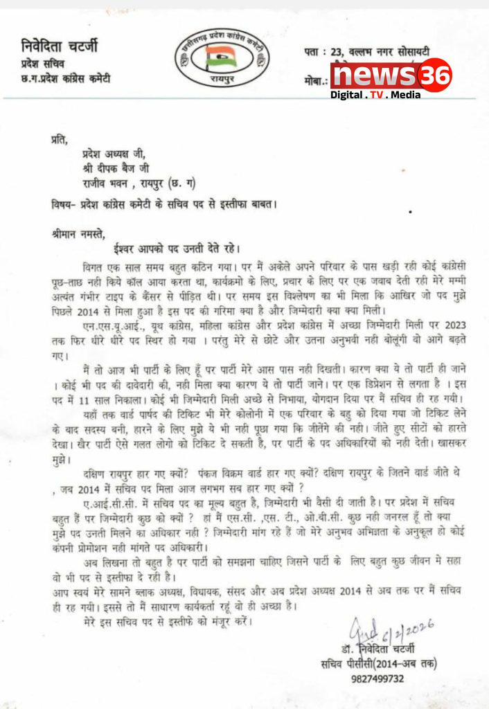 छत्तीसगढ़ कांग्रेस में ‘लेटर बम’: 11 साल का दर्द छलका, पीसीसी सचिव निवेदिता चटर्जी का इस्तीफा