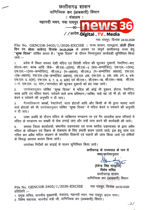 छत्तीसगढ़ सरकार ने स्पष्ट कर दिया है कि इस बार की होली केवल रंगों वाली होगी, ‘नशे’ वाली नहीं। आबकारी विभाग द्वारा जारी ताज़ा फरमान के मुताबिक, 4 मार्च 2026 को पूरे प्रदेश में ‘शुष्क दिवस’ (Dry Day) घोषित किया गया है।