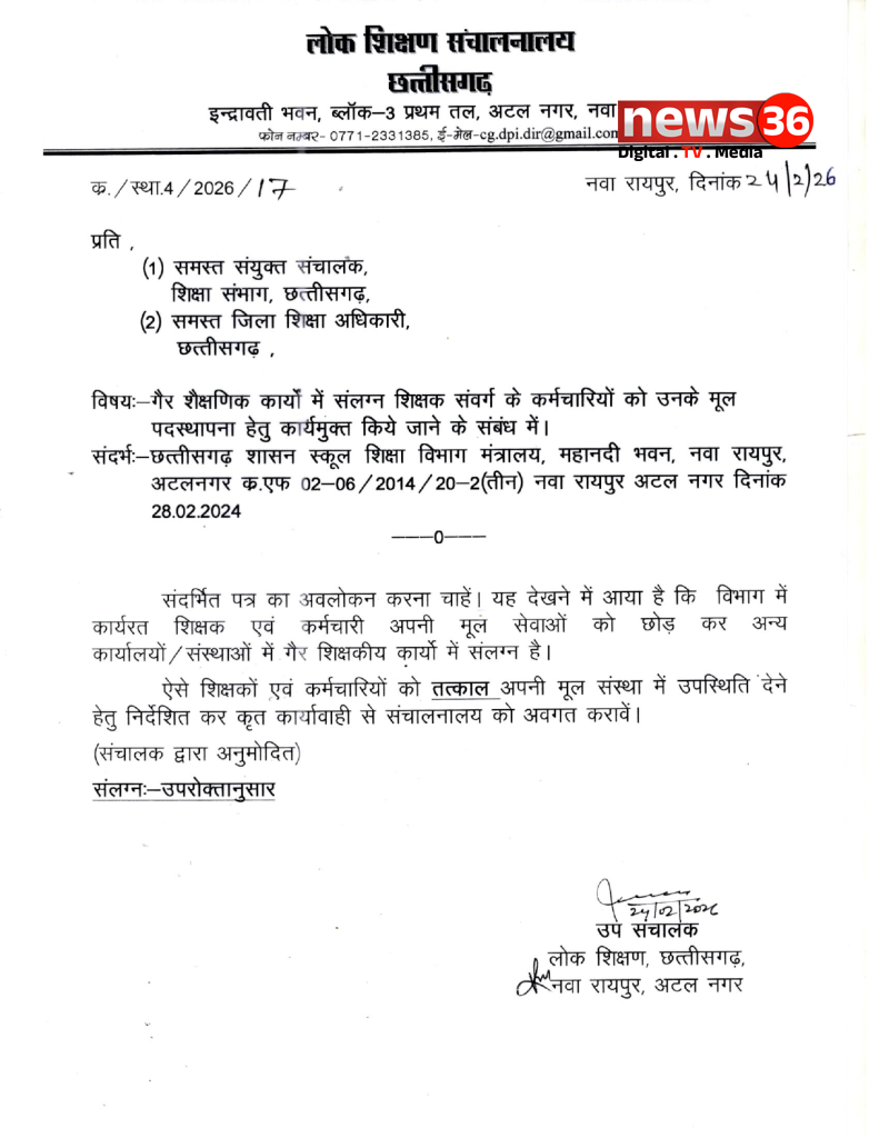 छत्तीसगढ़ में शिक्षा की गुणवत्ता सुधारने और स्कूलों में शिक्षकों की उपलब्धता सुनिश्चित करने के लिए लोक शिक्षण संचालनालय (DPI) ने बड़ा कदम उठाया है। विभाग ने ऐसे सभी शिक्षकों और कर्मचारियों को तत्काल प्रभाव से कार्यमुक्त करने का आदेश दिया है, जो अपने मूल शैक्षणिक कार्य को छोड़कर अन्य कार्यालयों या संस्थानों में संलग्नीकरण (Attachment) पर हैं।