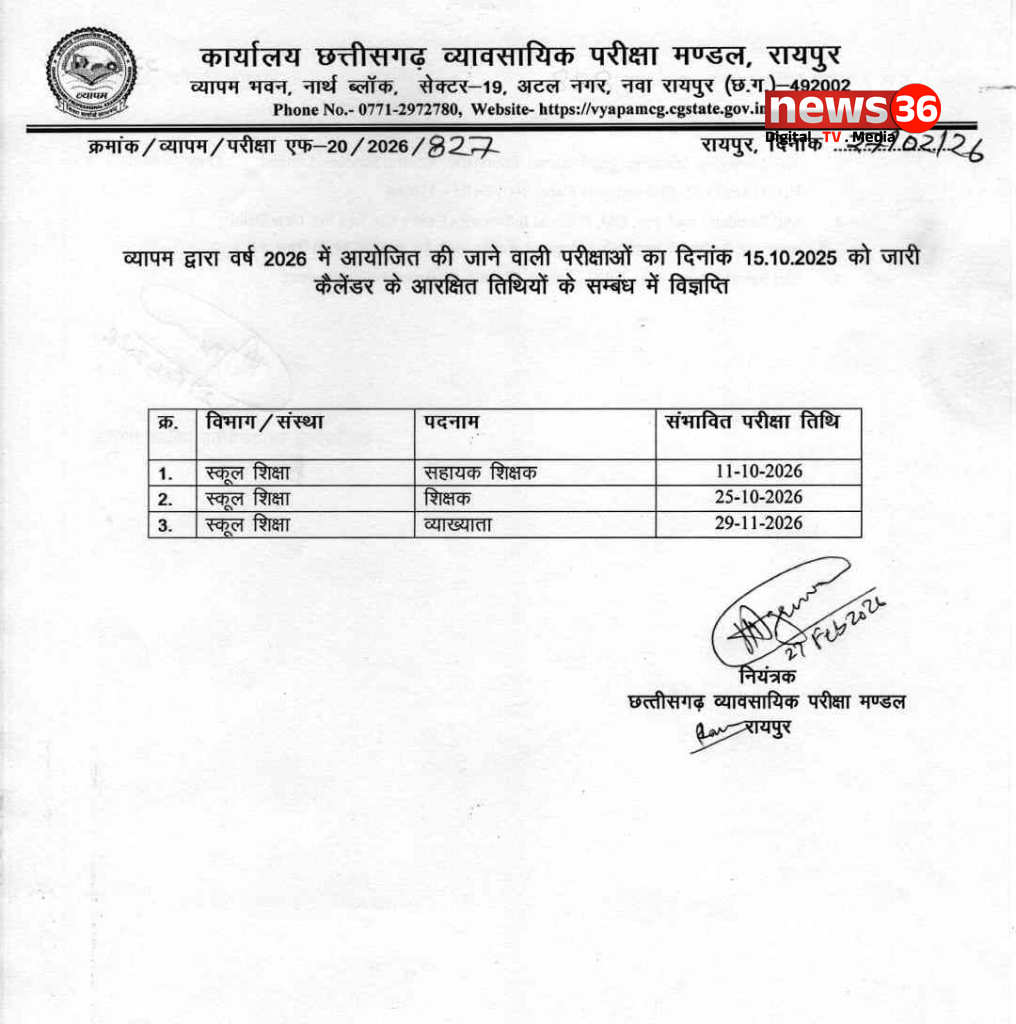 मुख्यमंत्री साय ने कहा कि व्यापम द्वारा वर्ष 2026 में आयोजित होने वाली शिक्षक भर्ती परीक्षाओं की संभावित तिथियां जारी कर दी गई हैं। निर्धारित कार्यक्रम के अनुसार सहायक शिक्षक की परीक्षा 11 अक्टूबर 2026, शिक्षक की परीक्षा 25 अक्टूबर 2026 तथा व्याख्याता की परीक्षा 29 नवंबर 2026 को संभावित है।