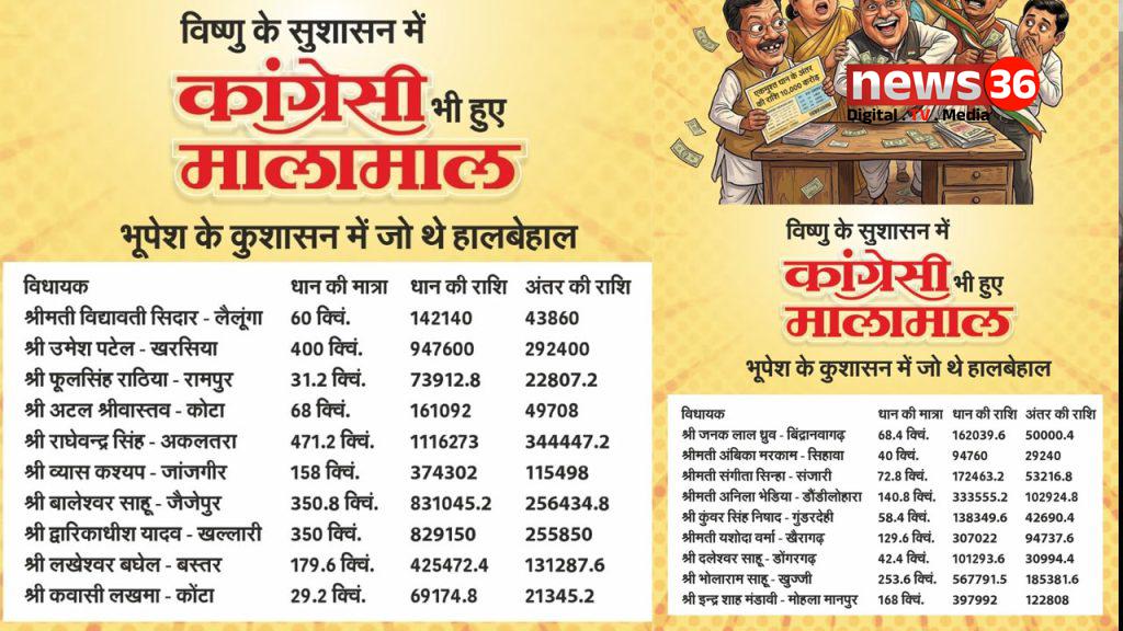 बीजेपी सूत्रों द्वारा साझा की गई जानकारी के मुताबिक, धान खरीदी की अंतर राशि (लगभग ₹917 प्रति क्विंटल) के रूप में इन नेताओं को बड़ी रकम मिली है