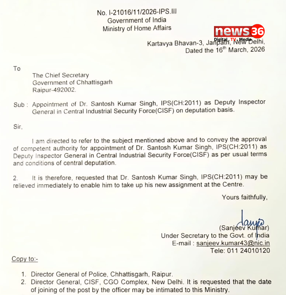 छत्तीसगढ़ कैडर के IPS संतोष सिंह जाएंगे सेंट्रल डेपुटेशन पर, CISF में मिली प्रतिनियुक्ति