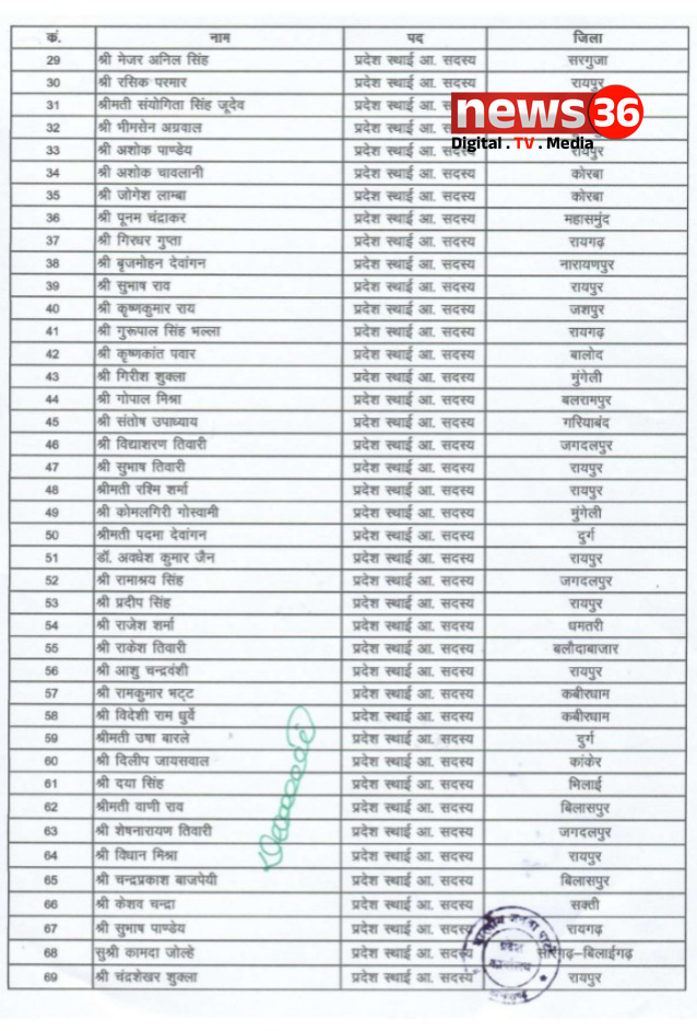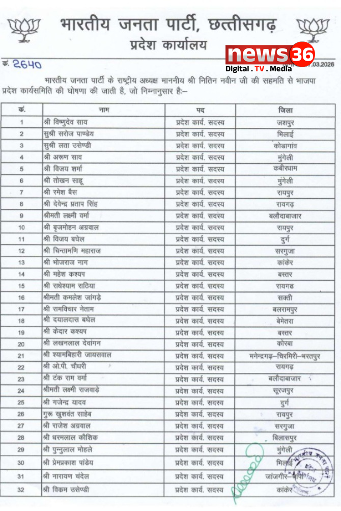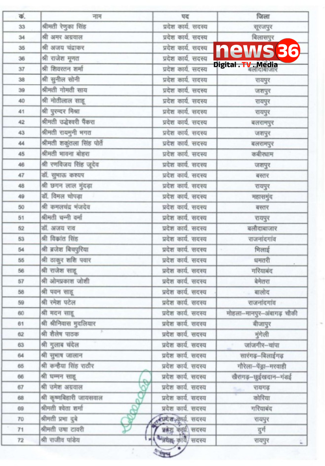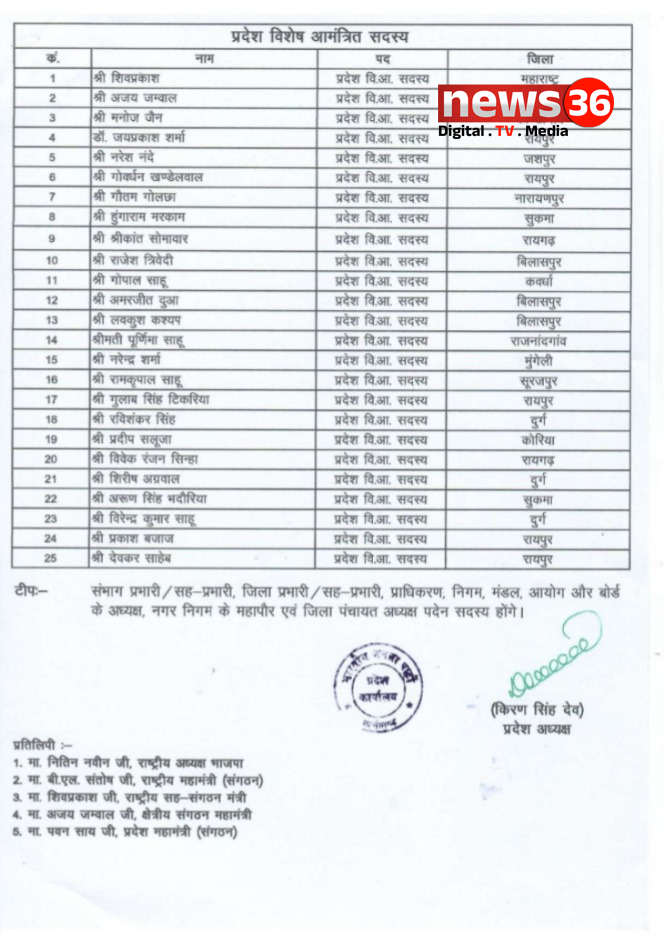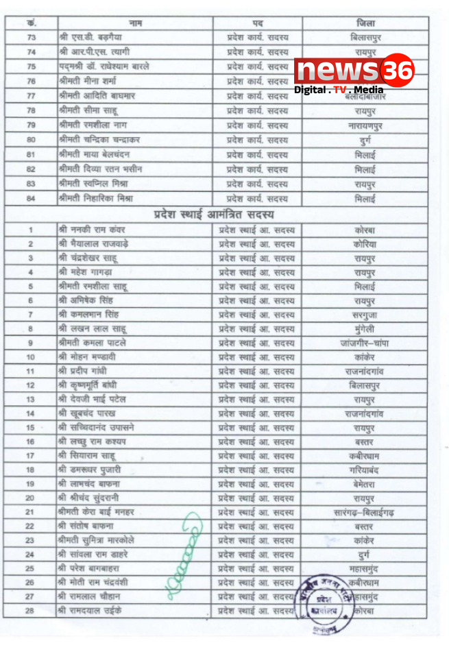 बीजेपी के राष्ट्रीय अध्यक्ष नितिन नबीन की सहमति से सीएम विष्णुदेव साय की अगुवाई में 84 सदस्यीय प्रदेश कार्यसमिति का गठन किया है। वहीं पूर्व गृह मंत्री ननकीराम कंवर की अगुवाई में 69 सदस्यीय प्रदेश स्थाई आमंत्रित सदस्य का गठन किया है। इसके साथ ही शिवप्रकाश की अगुवाई में 25 सदस्यीय प्रदेश विशेष आमंत्रित सदस्य का गठन किया है।