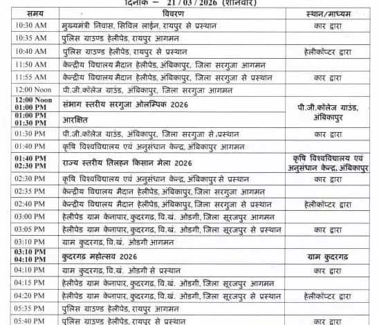 दिनभर के कार्यक्रमों के बाद मुख्यमंत्री शाम 5:35 बजे रायपुर लौटेंगे। कुल मिलाकर, सरगुजा ओलंपिक 2026 और अन्य आयोजनों के जरिए क्षेत्र में खेल, कृषि और विकास को नई गति मिलने की उम्मीद है।