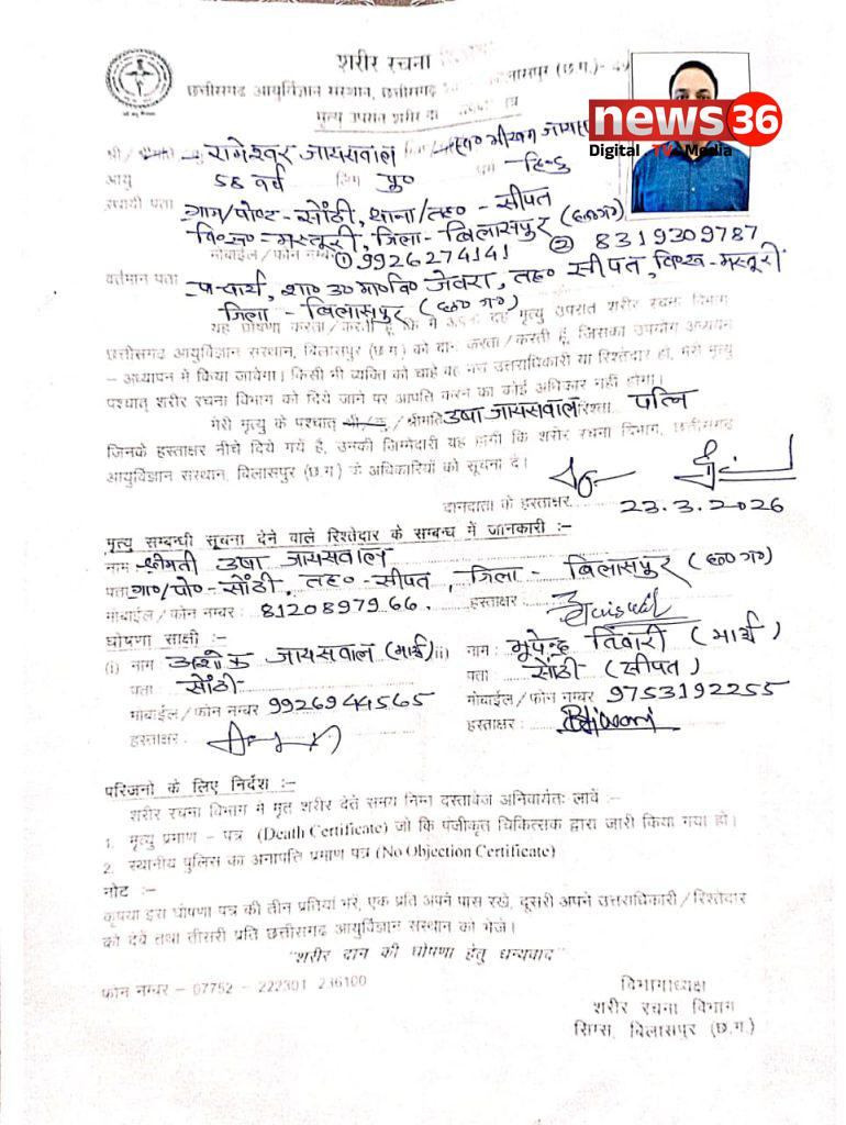 अपने संकल्प को लेकर श्री जायसवाल ने भावुक शब्दों में कहा कि यह शरीर नश्वर है, लेकिन अगर मेरे जाने के बाद मेरे अंग किसी जरूरतमंद के जीवन को रोशनी दे सकें, तो इससे बड़ा पुण्य कोई नहीं। मैं चाहता हूं कि लोग आगे आएं और देहदान, अंगदान के लिए जागरूक बनें। उन्होंने आगे कहा कि यह केवल व्यक्तिगत निर्णय नहीं, बल्कि समाज में जागरूकता फैलाने का एक प्रयास है। उन्होंने छत्तीसगढ़ आयुर्वेद ज्ञान संस्थान (सिम्स) से फॉर्म मंगाकर विधिवत प्रक्रिया भी पूर्ण की।
